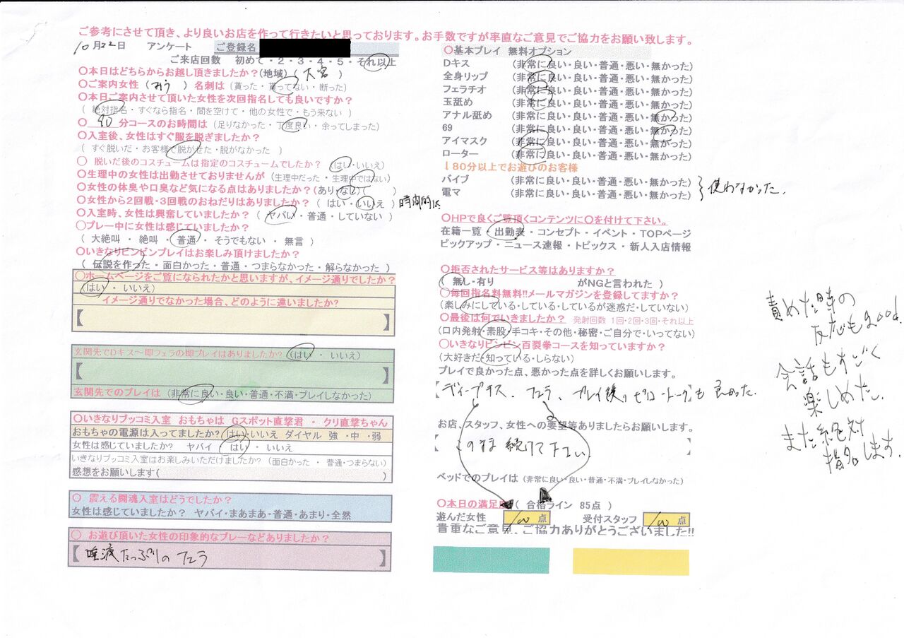 お遊び必見の超オススメ女性♪スタイル抜群!整った綺麗系ルックス!おっとり癒し系な雰囲気で風俗嬢ぽくない「りょうさん」ですが…実はエッチな事が大好きな生粋のドスケベ女性!実りに実ったGカップのオッパイは揉み心地抜群で包みこまれたオチ◯ポは何回出してもビンビン止まらない!綺麗なお顔に大きなオッパイ、クビレがありプリッとしたお尻に細いおみ足とドエロい身体つきに加え性欲旺盛と…非の打ち所がありません!!!お客様想いの優しい性格でプレイ中の気遣いやお客様の要望に一生懸命応えようとしてくれる良い女性♪ご奉仕精神も抜群でじっくり味わうように行うフェ◯チオは優しさと激しさのWパンチ!緩急のついた極上物のフェ◯チオに感動してしまいます♪感度も申し分なく生粋M嬢なので責めたときの反応も抜群!濡れやすい体質で膨れ上がったクリ◯リスを少し弄っただけでびしょ濡れになってしまい膣内を優しく責めれば身体をビクビク震わせドエロい喘ぎ声を上げてイッちゃう超敏感体質!スタイル・ルックス・性格・プレイ内容と風俗で遊ぶ際に欲しい要素が全てにおいてトップレベルの女性です!出勤時間が早い時間帯が多いのでご予約ご指名はお早めが超オススメです!彼女の魅力を余すこと無く時間いっぱいご堪能下さいませ♪